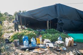 Al incursionar en el área con helicópteros y unidades terrestres, se localizaron un total de 1,835 plantas de marihuana, de aproximadamente dos metros de altura, dos cubetas llenas del vegetal, cinco extractores, cuatro extensiones eléctricas, una bomba de regadío, un martillo, una pinza, un tanque, tres botellones de agua, dos colcha espuma, una carretilla, rollos de tela, un serrucho, varios garrafones de combustible, entre otras evidencias.